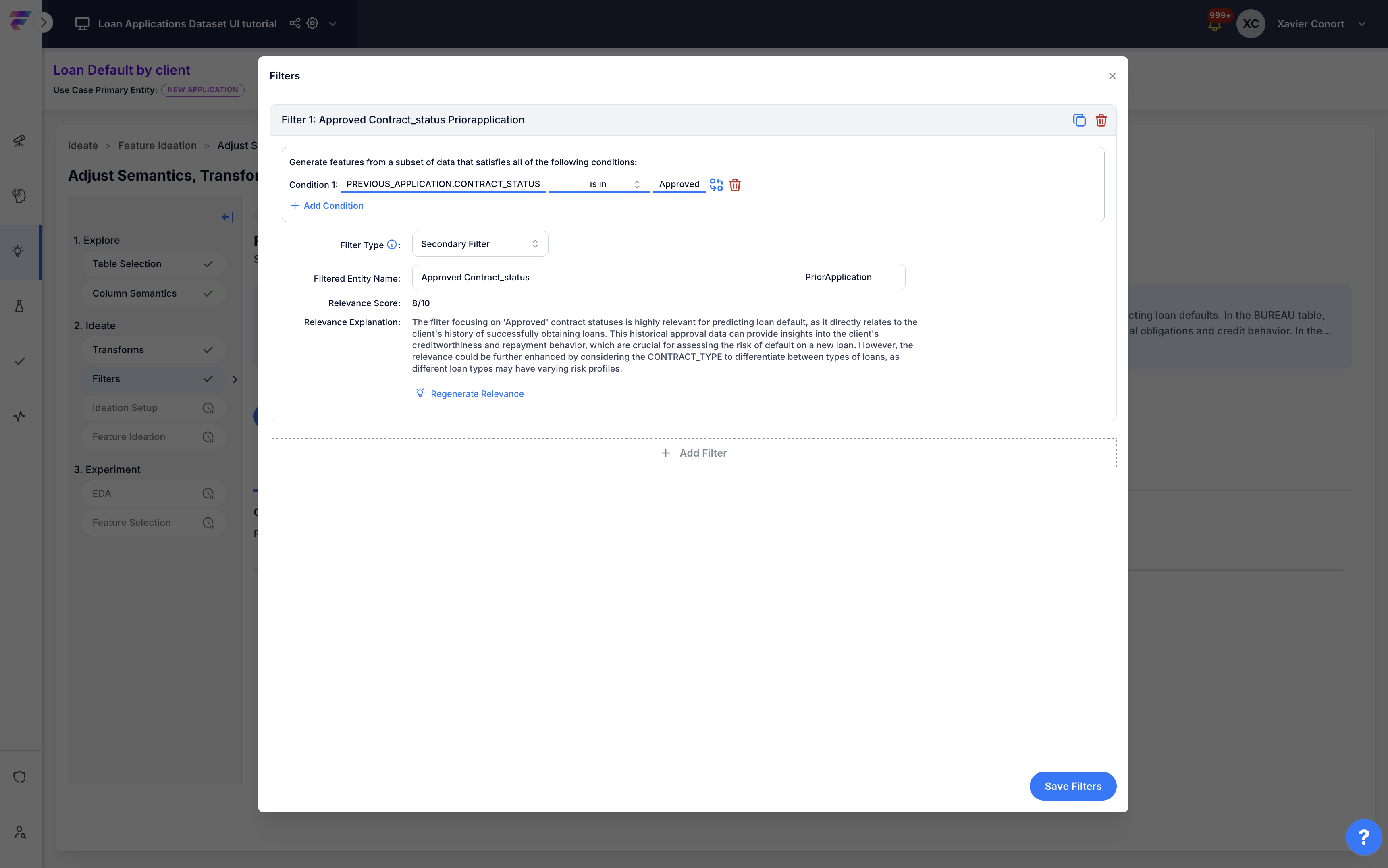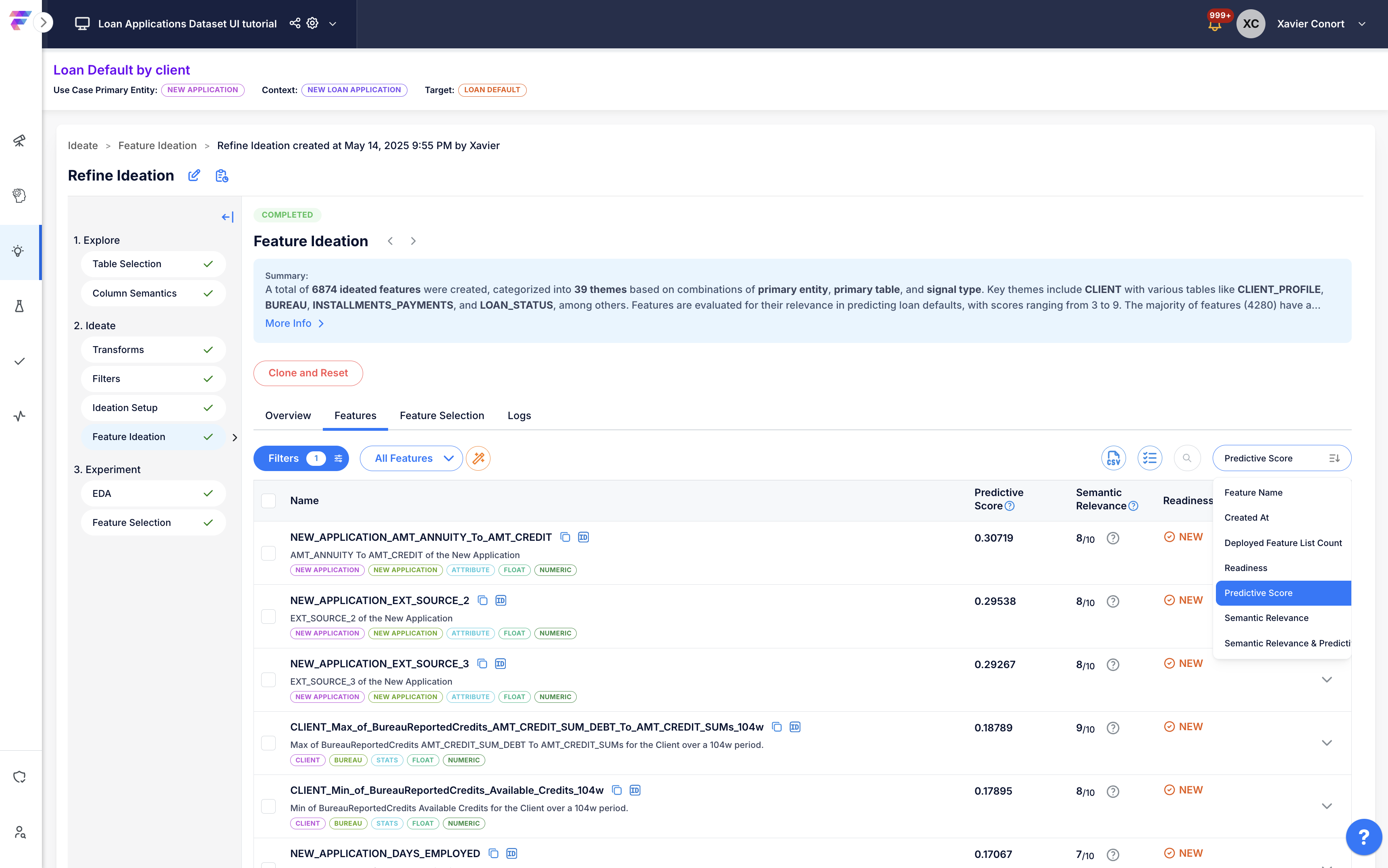 Clone and reset the Feature Ideation to adjust the system's suggestions for column semantics, transforms and filters.