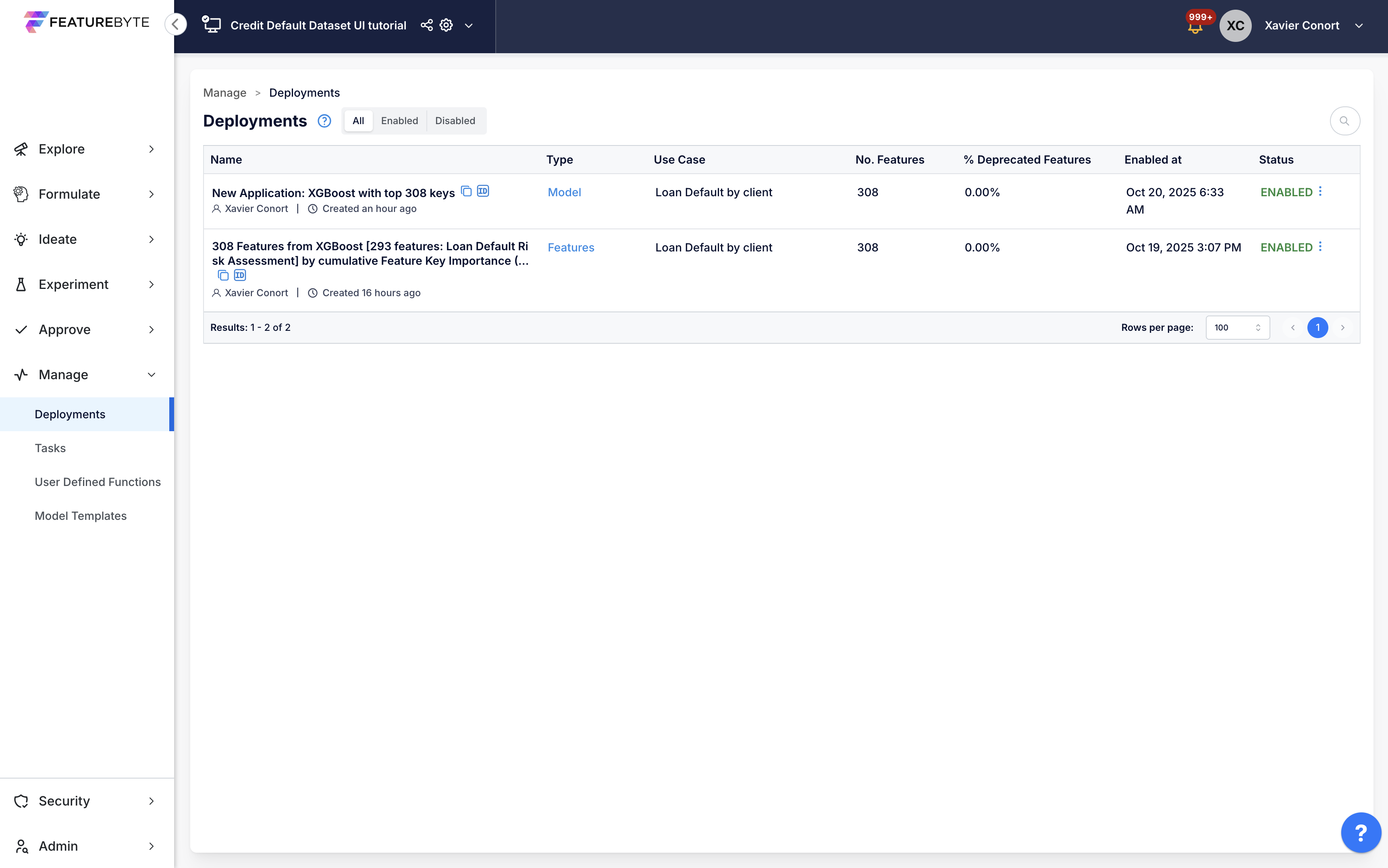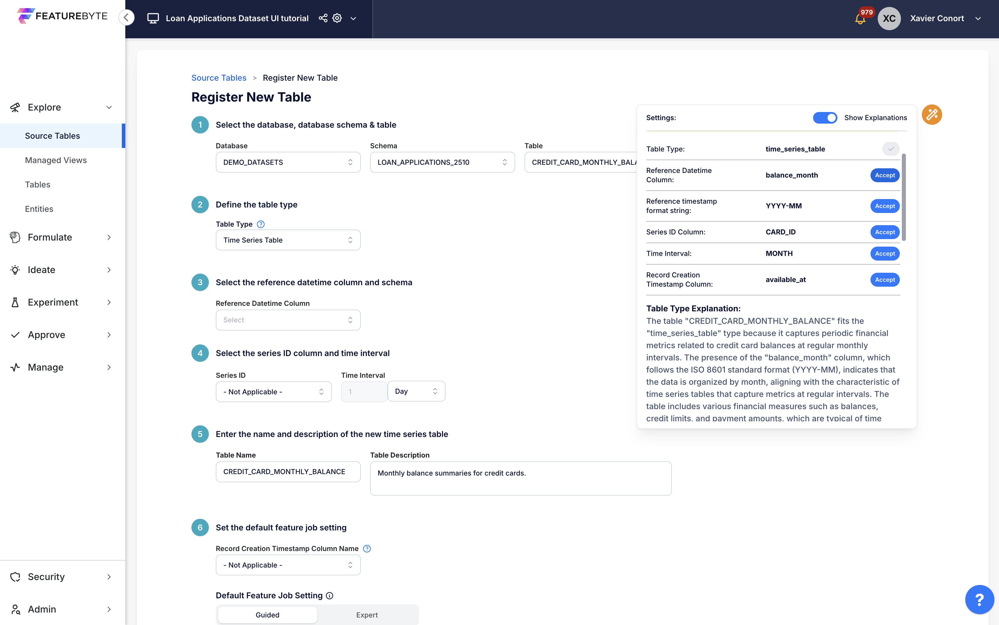 Discover FeatureByte's interface with our step-by-step Credit Default UI tutorials. Learn how to create a catalog, define your data model, and articulate your use cases. See how Ideation automatically suggests features and models tailored to those cases. You’ll also explore building custom feature lists, training models, managing deployments, and navigating version control to handle changes in source table availability and quality.